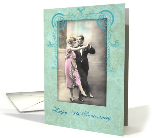 happy 14th wedding anniversary, vintage dancing couple, pink and turquoise card
