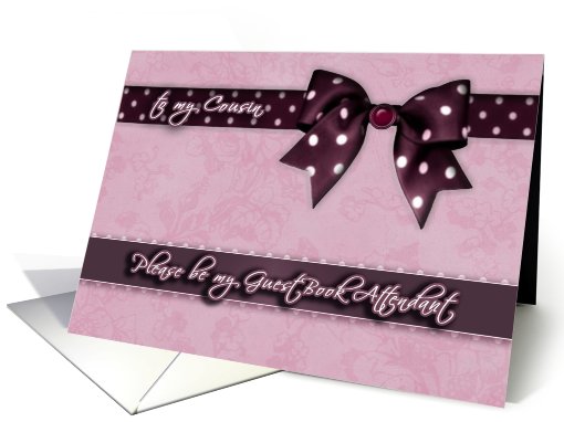 to my cousin, please be my guest book attendant, purple and pink, bow and ribbon effect card