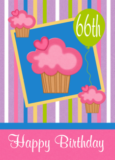 66th Birthday, Pink cupcakes on blue in a frame with a green balloon