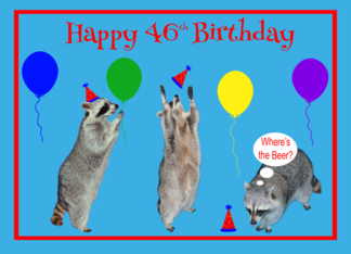 46th Birthday, Raccoons with party hats and colorful balloons on blue
