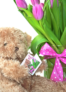 86th Birthday brown teddy bear with tulip bouquet and polka dot bow
