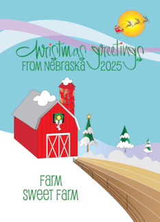 Christmas Greetings from Nebraska Red Farm Barn and Decorated Trees