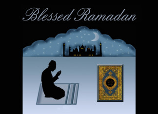 Blessed Ramadan Blank Card - Cresent Moon, Praying Man & Mosque