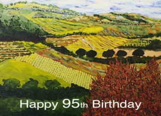 Happy 95th Birthday - Hills, Fields and Vineyards with Red Bush