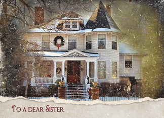 Sister's Christmas, old Victorian house in snow with torn edge border