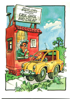 Cartoon woman in car purchasing birthday card at drive-thru stand