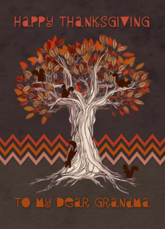 Happy Thanksgiving to my Gran, tree, squirrel illustration, chevron.