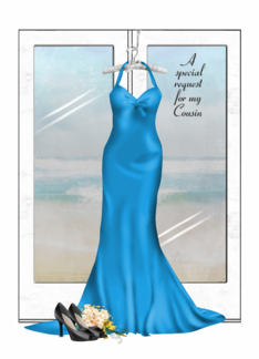Maid of Honor request for Cousin-blue gown with shoes and bouquet