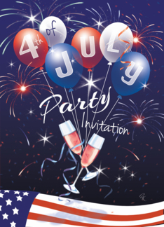 4th Of July, Party Invitation - 2 Glasses, Balloons, and Fireworks