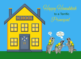 Happy Hanukkah to Principal, Raccoons wearing book bags on blue