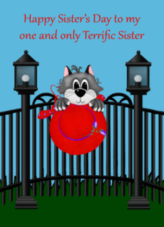 Sister's Day to Only Sister, Cat on a fence with red hat, light posts
