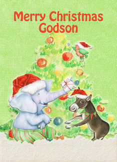 Merry Christmas to Godson Cute Elephant,Donkey,Bird and Tree