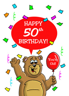 50th Birthday Card with a Cartoon Bear, Balloon and Confetti