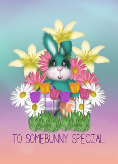 Adorable Teal Bunny Among the Lilies, Pink and White Daisies, Tulips
