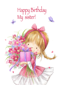 Happy Birthday My sister, Cute Girl with Present and Flowers