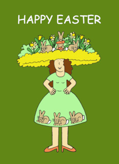 Lady in Easter Bonnet and Bunny Dress Cartoon Humor