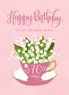 76, Aunt, Happy Birthday, Teacup, Lily of the Valley, Hand Lettering