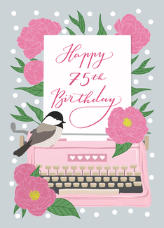 Happy 75th Birthday with Typewriter, Chickadee Bird and Pink Flowers