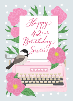 Happy 42nd Birthday Sister with Typewriter, Chickadee Bird and Flowers