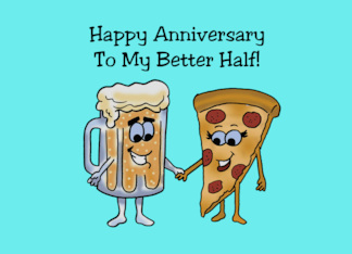 Humorous Anniversary For Spouse With Cartoon Beer And Pizza