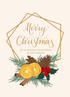Grandson and Family with Christmas Frame Pine Cones Holly and Spices