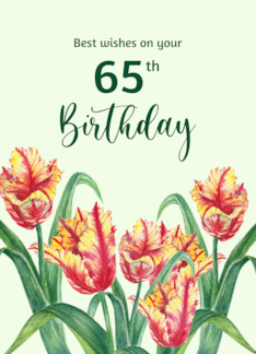 65th Birthday Wishes Watercolor Bright Yellow Parrot Tulips Painting