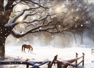 Seasons Greeting Country Horse in Snow with Cardinals Old Fence Cute