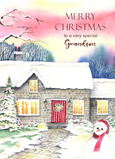 For Grandson on Christmas Snowy Cottage Watercolor Painting