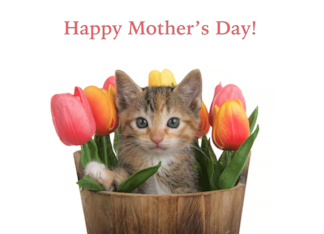 Calico Tabby Kitten peeking out of a Bucket of Tulips Mother's Day