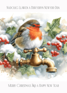 Christmas Card Bilingual Welsh and English Robin on a Brass Tap