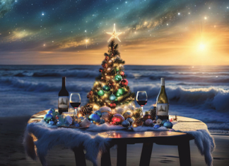 Christmas Holiday Wine on the Beach Ocean with Christmas Tree