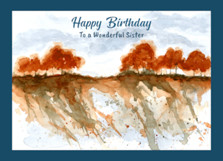 Happy Birthday Sister Red Trees Landscape Sky Hillside Watercolor Art