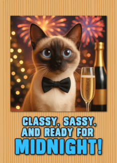 Siamese Cat with Bow Tie and Champagne New Year Fireworks