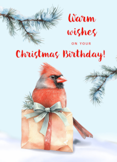 Christmas Birthday Cardinal with Gift in Watercolor Snow.