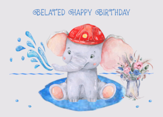 Belated Birthday with a Cute Elephant with a Vase of Wildflowers