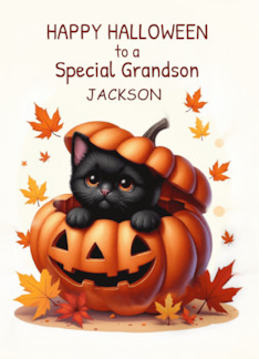 Grandson Custom Name Halloween Cute Black Cat in Pumpkin