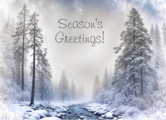 Seasons Greetings Christmas with Winter Landscape Trees Stream Custom