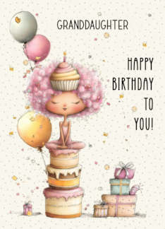 Granddaughter Birthday Girl Sitting on Birthday Cake and Presents