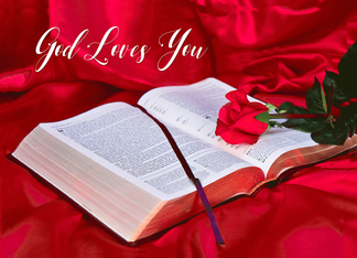 God Loves You, Encourage, Religious, Bible with Red Rose on Red Silk