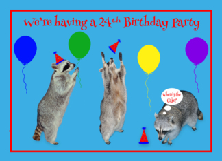 Invitations, 24th Birthday Party, Raccoons with party hats, balloons