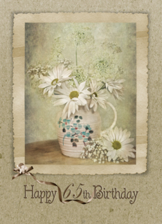 65th birthday-daisy and Queen Anne's Lace bouquet in old pitcher