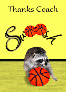 Thank You to Coach, a cute raccoon with a basketball on yellow