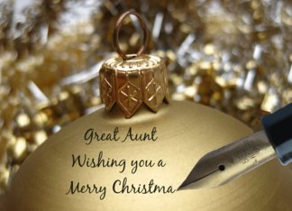 Great Aunt christmas greeting - fountain pen writing christmas message on golden ornament