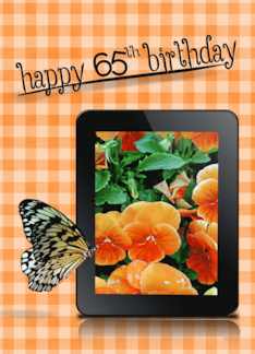 Butterfly on Electronic Tablet with Orange Pansies for 65th Birthday