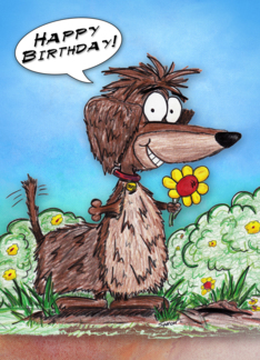 Cartoon Dachshund Digging up Flowers Happy Birthday Card
