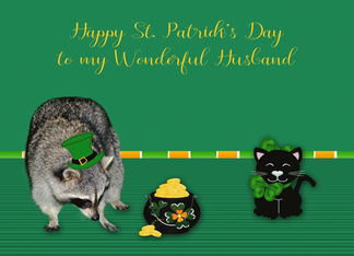 St. Patrick's Day to Husband, Raccoon wearing hat with a pot of gold