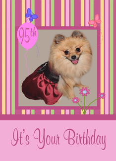 95th Birthday, Adorable Pomeranian smiling wearing a pretty dress